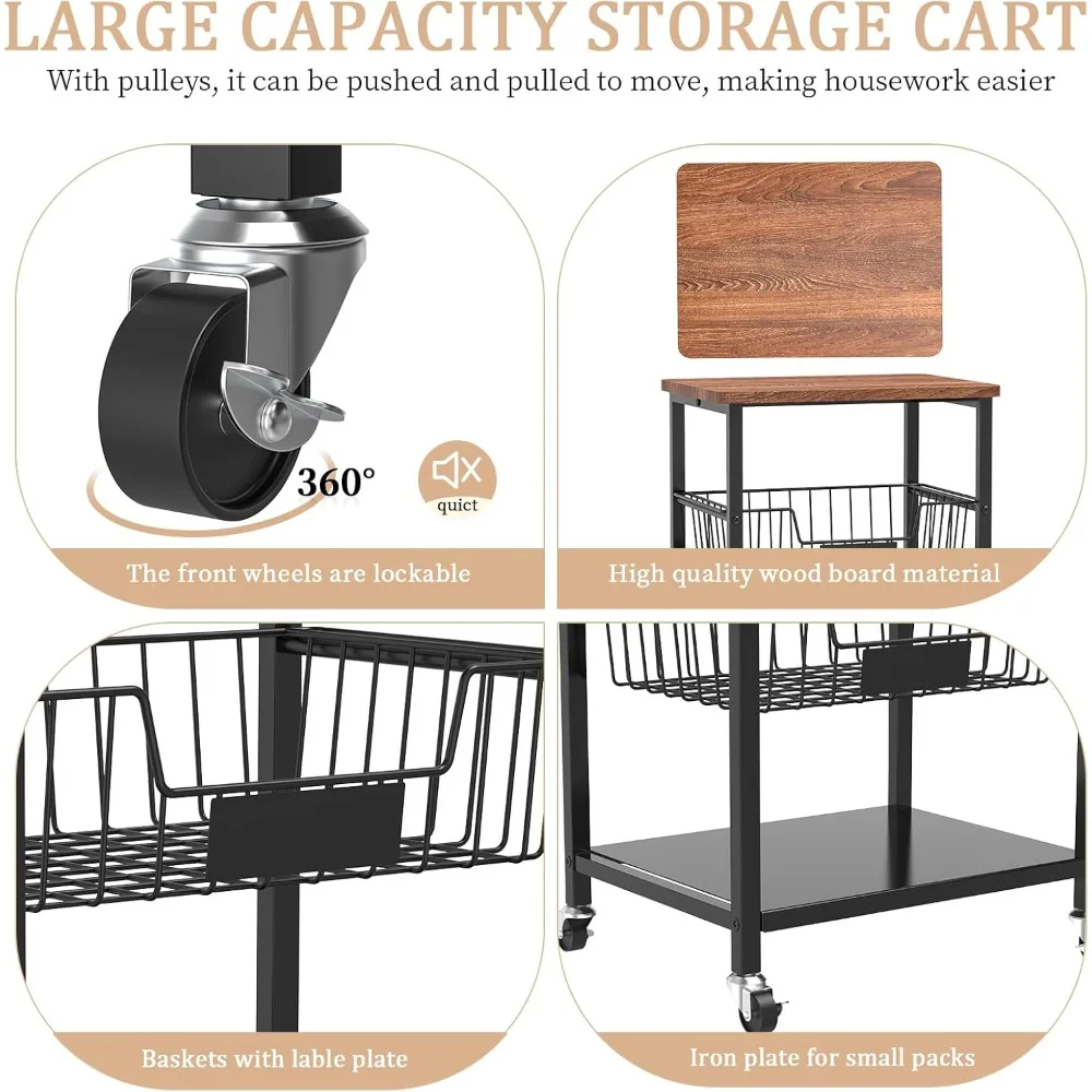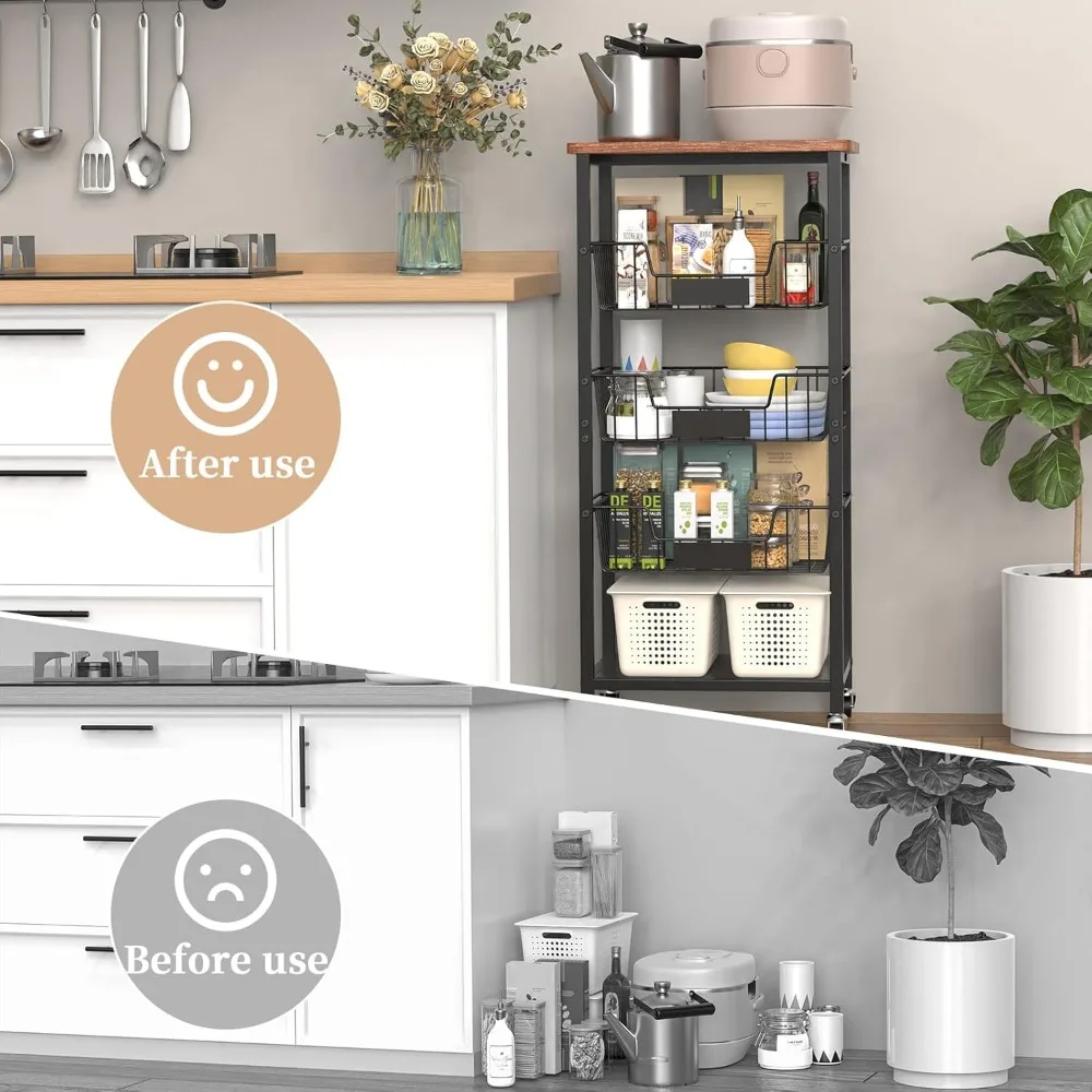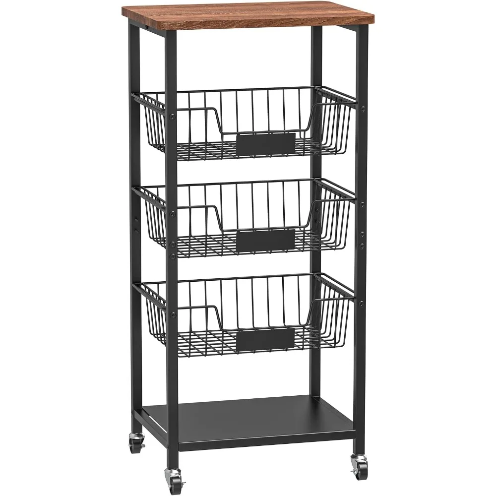 Kitchen Storage Cart, Kitchen Basket, 5-Tier Utility Organizer with Baskets and Wood Top, Rolling Snack Cart with Wheels, Metal